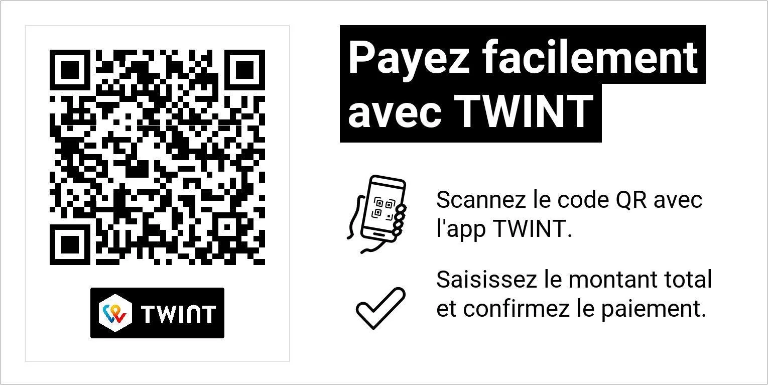 Scannez le code QR avec l'application TWINT. Saisissez le montant total et confirmez.